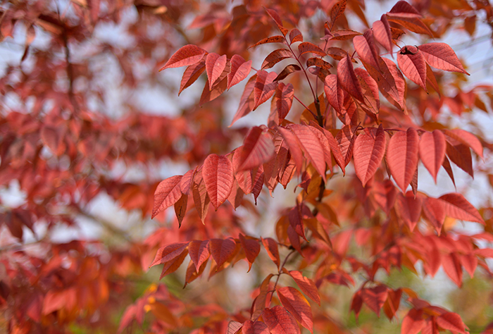 秋紫白蠟Fraxinus americana‘Autumn Purple’,木犀科梣屬。喜光、耐寒,耐鹽堿、萌蘗力強,生長快;落葉小喬木,葉片較大,最大可達15cm;葉脈較突出,緣有希鋸齒;葉色10月初變為紫紅色,鮮艷美麗,彩葉期可持續半個月左右;我國東北南部、華北、華東、中南至西南地區區域內均可生長。